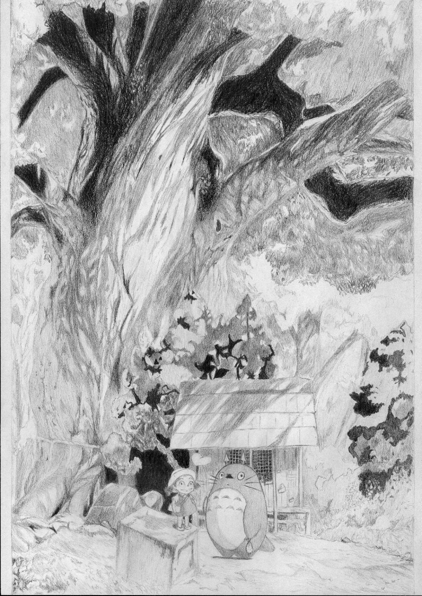临摹这张龙猫废了老牛劲了。整个一张纸,没几处白的,全都涂黑或涂灰了。8B铅笔快用没了,4B铅笔也消耗严重,至于花了多长时间?天晓得,反正是去年开始画的,一些细节本来可以画得更好的,可惜我的耐心几近消耗殆尽,有点虎头蛇尾的意思。